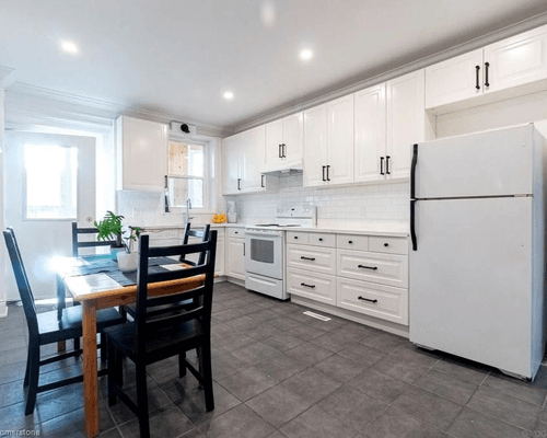 A stunning exposed brick wall stretches over 250 sq. ft., infusing the heart of the home with an element of bold style and remarkable character.